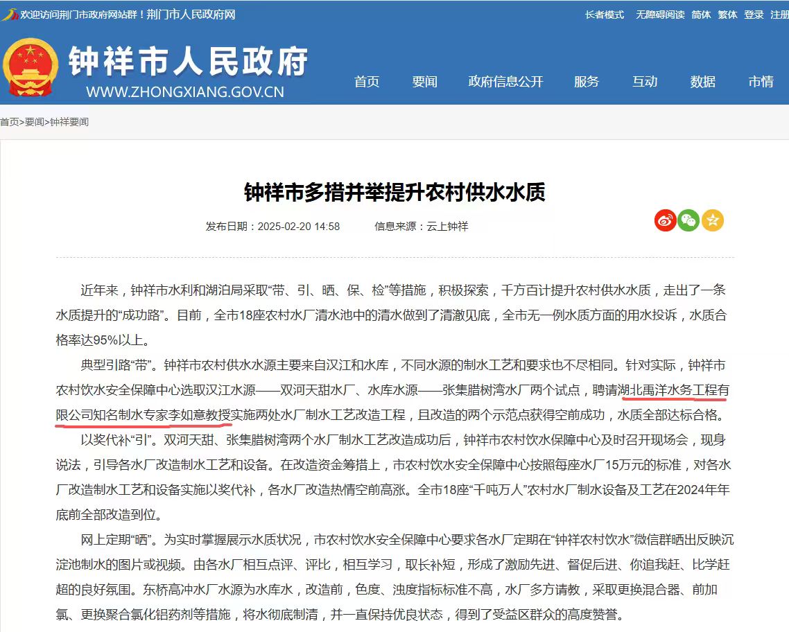 典型引路“带”。钟祥市农村供水水源主要来自汉江和水库,不同水源的制水工艺和要求也不尽相同。针对实际,钟祥市农村饮水安全保障中心选取汉江水源--双河天甜水厂、水库水源--张集腊树湾水厂两个试点,聘请湖北禹洋水务工程有限公司知名制水专家李如意教授实施两处水厂制水工艺改造工程,且改造的两个示范点获得空前成功,水质全部达标合格。
